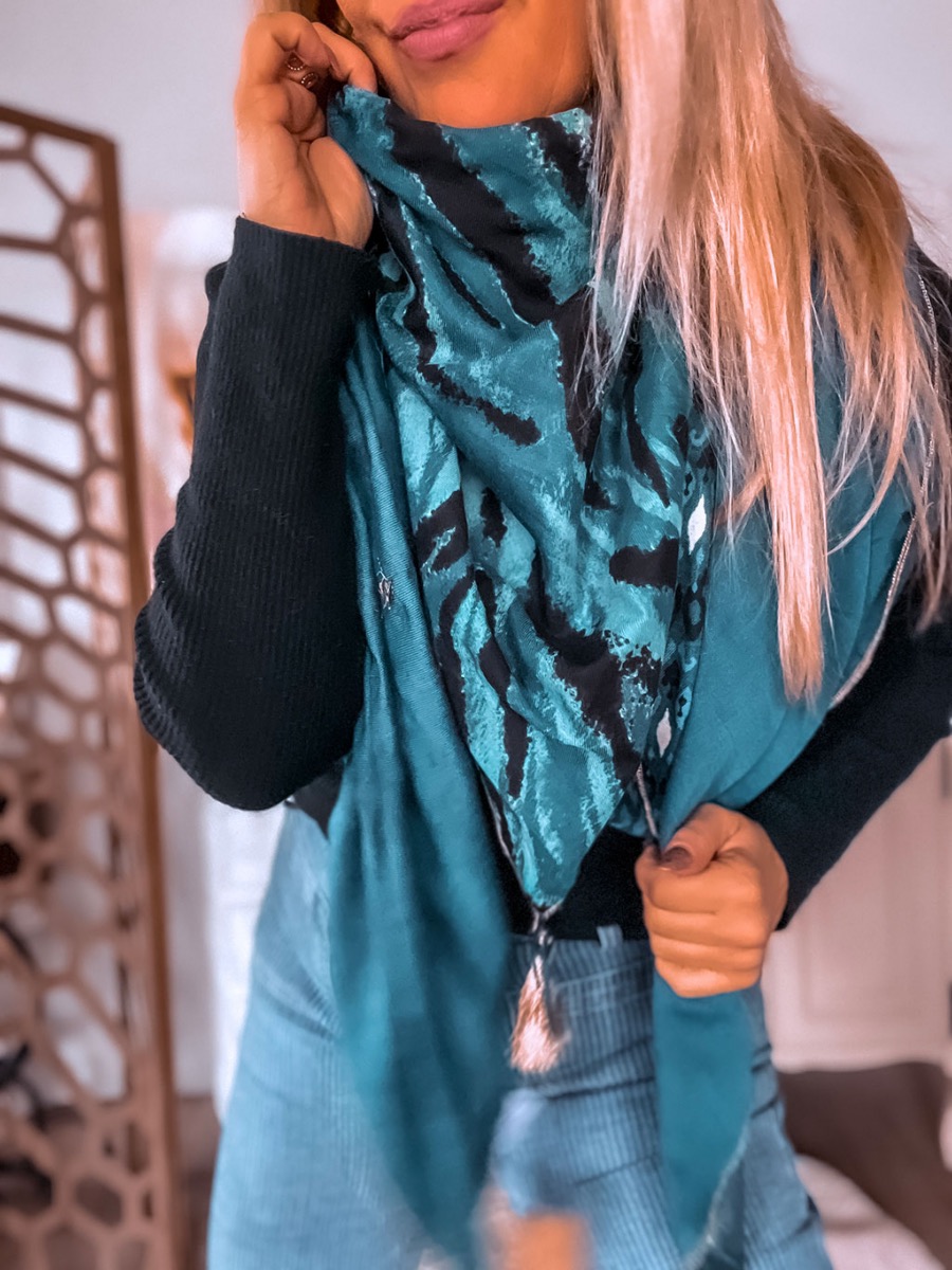 Porte-la en version chèche triangulaire sur un pull noir pour un look chic et moderne, ou nouée façon étole sur ton manteau d’hiver pour une touche glamour.