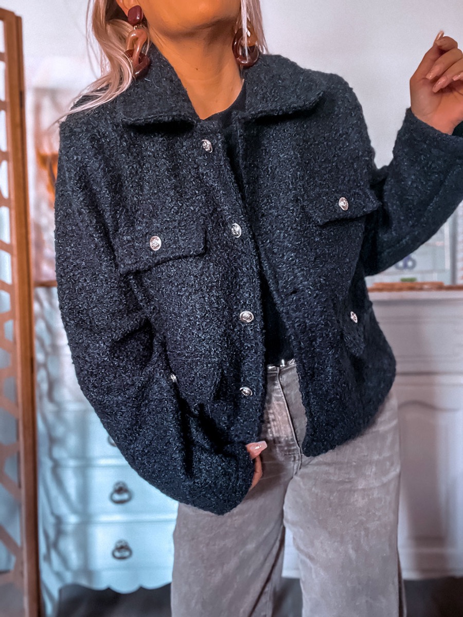 Adopte la tendance de la saison avec notre veste femme en bouclette noire ! Son tissu texturé apporte chaleur et confort, tandis que sa coupe droite et ses boutons  lui donnent une allure moderne et élégante.