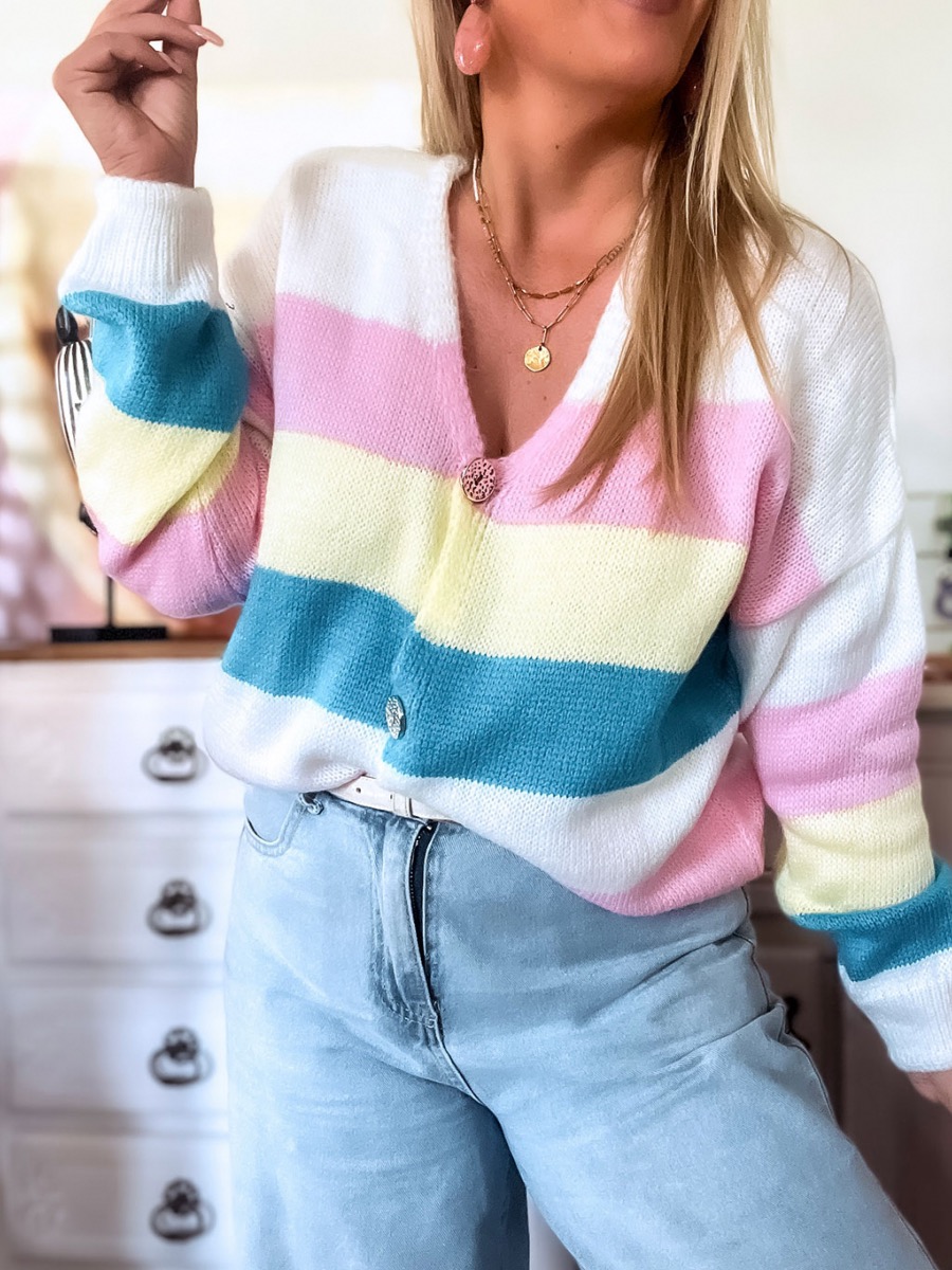 Apporte de la bonne humeur à ta garde-robe avec ce magnifique gilet femme en maille légère aux rayures multicolores. Ses teintes rose, jaune pastel, bleu  et blanc s’accordent parfaitement pour un look frais et pétillant.
