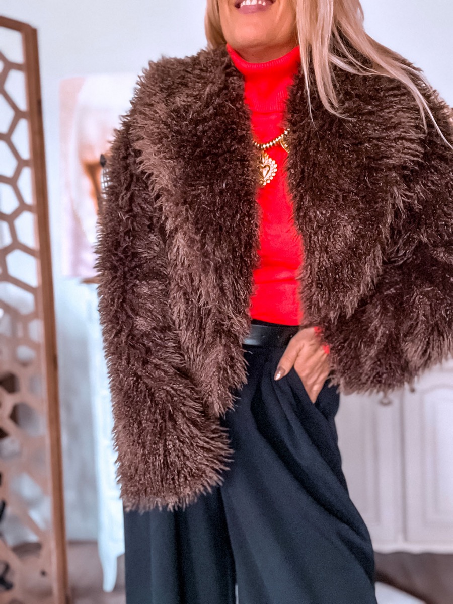veste fausse fourrure femme, veste peluche, manteau fausse fourrure marron, veste hiver femme chic, veste nounours, fausse fourrure chocolat, veste chaude femme, mode hiver 2025